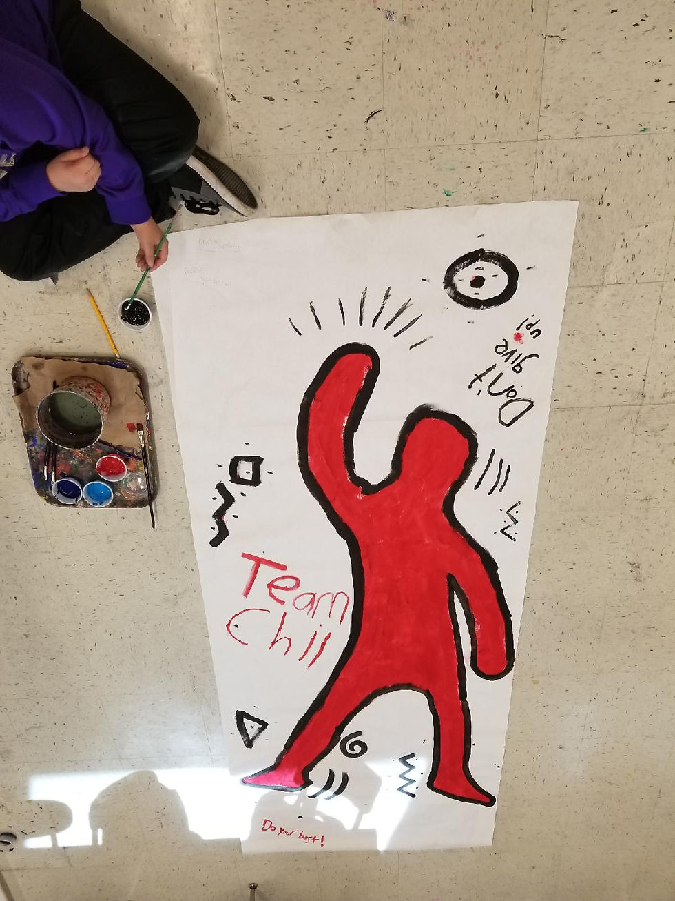 First, students were broken up into groups. They then were to choose an action word from a hat and come up with two poses to turn into a painting. One of the group members laid down as the others traced the body. They all worked together to paint inside their people and add words and graffiti symbols around the bodies. Theres something about painting that is just really relaxing to students and it definitely focuses their attention in these last few weeks.
